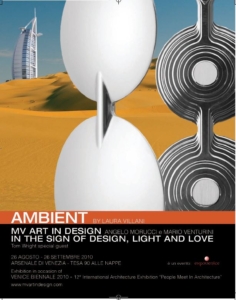 La mostra Ambient, Art and Architecture, ideata e curata da Laura Villani nella suggestiva Tesa 90 alle Nappe dell’Arsenale di Venezia, è un evento di Expovenice organizzato in occasione della 12° edizione della Biennale di Venezia 2010, International Architecture Exhibiton “People Meet in Architecture” che va a visualizzare, attraverso le opere degli artisti, designer e architetti invitati, l’integrazione nell’architettura della scultura vista come elemento di valorizzazione e identità, strumento progettuale essenziale di definizione e caratterizzazione dello spazio, elemento di completamento in ambito architettonico e urbano di ogni edificio che valorizza l’opera d’arte con una collocazione progettata.