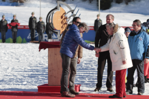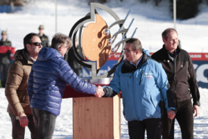 Angelo Morucci e Gian Franco Kasper Presidente F.I.S alla consegna dell’opera”Chi scia sa volare”alla chiusura dei mondiali.