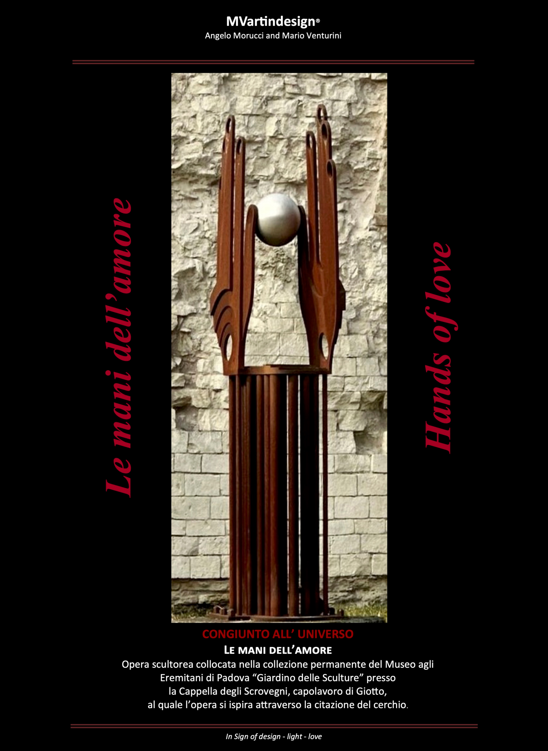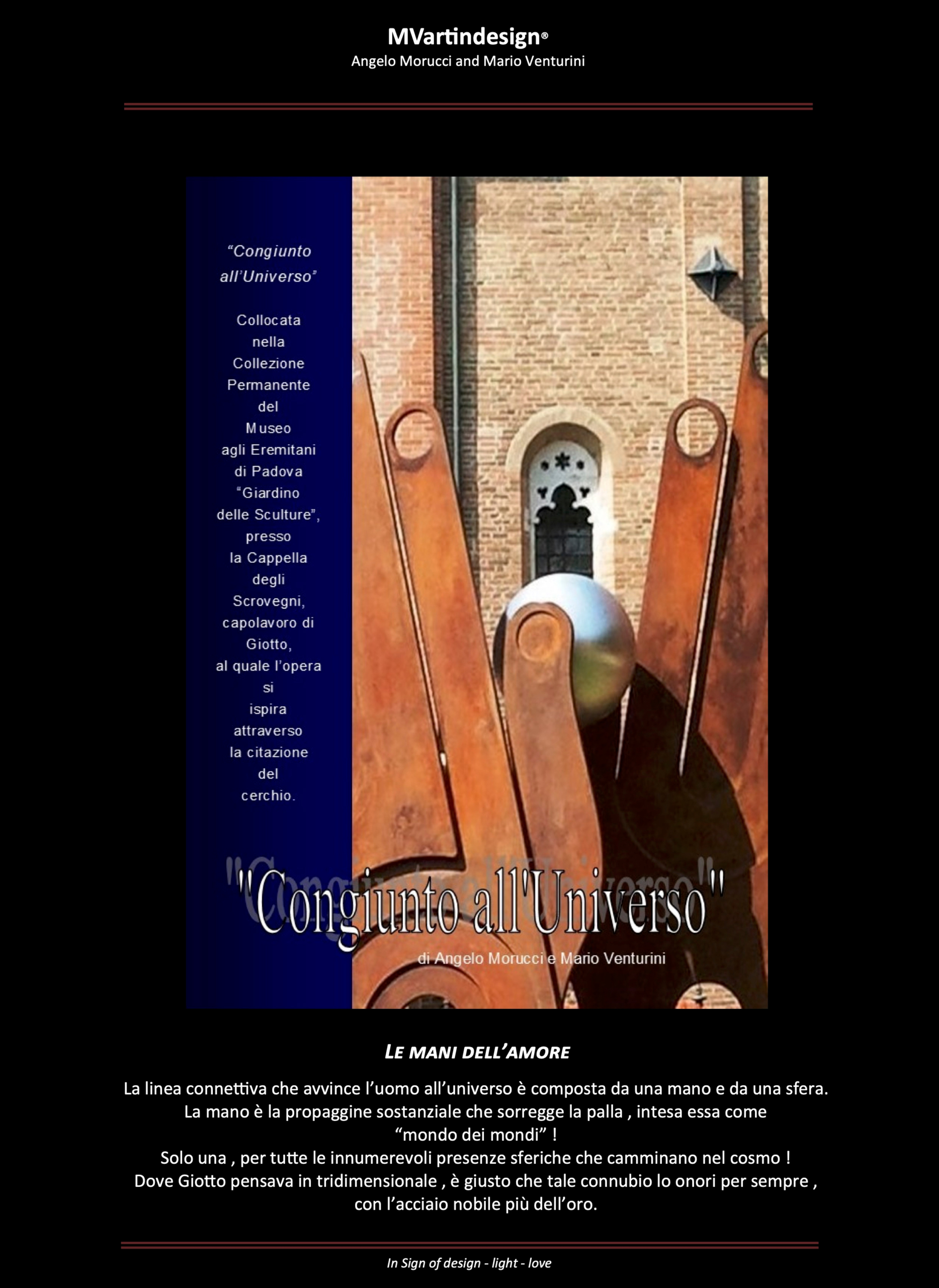 Al Museo d’Arte Medioevale e Moderna di Padova è stata inaugurata l’opera scultorea di Angelo Morucci e Mario Venturini “Congiunto all’Universo” della serie “Le mani dell’amore” collocata a vita nella collezione permanente nel giardino del Museo agli Eremitani attinente la Cappella degli Scrovegni nota in tutto il mondo per i suoi affreschi eseguiti tra il 1303 e il 1305 da Giotto. E’ ritenuta uno dei massimi capolavori dell’arte occidentale.